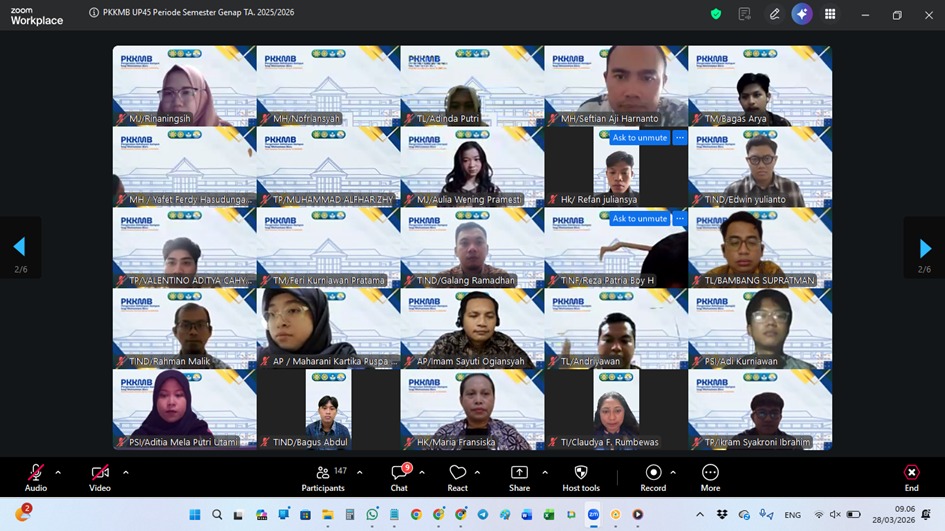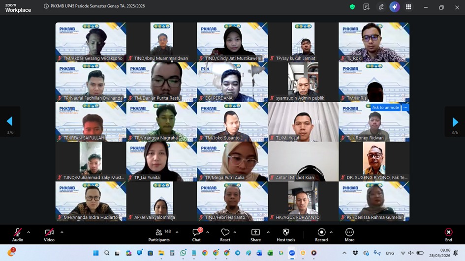 Pada hari Sabtu, 28 Maret 2026, mahasiswa baru dari Program Kelas Karyawan Universitas Proklamasi 45 menghadiri Pelantikan dan Pengarahan Mahasiswa Baru untuk Semester Genap Tahun Akademik 2025/2026. Kegiatan ini dilaksanakan secara daring melalui platform Zoom.